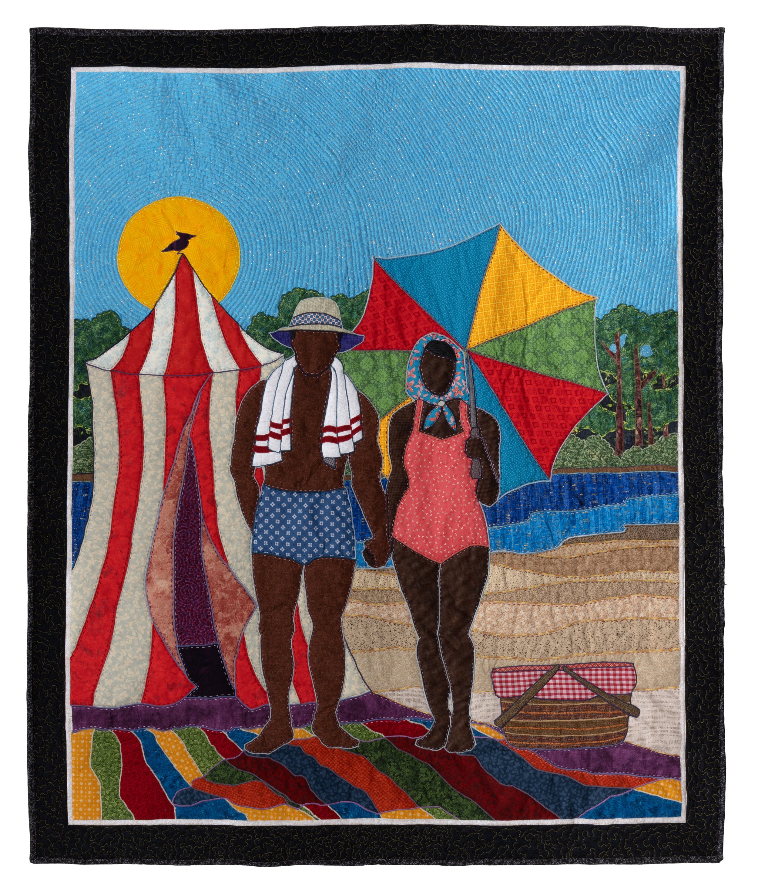 The painted panels in the exhibition are interpolations of photographer Bruce Mozert’s images taken as advertisements for Paradise Park, the segregated Black park side of Silver Springs, a park that offered glass-bottom boat rides, on the crystal clear water. The quilted pieces in the exhibition are Towns’ imagined respite for Black beach goers. The quilts Looking for Lorraine and A Taste of Lemonade offer an imagined safe space for two lesbian lovers set in nostalgic settings while the quilts I Will Follow You My Dear and Motown in Motion offer a look into young lovers escaping Jim Crow’s watchful eye under a glittering sky.